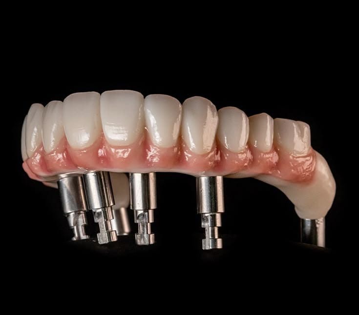 A seconda della valutazione ossea si decide se la protesi da posizionare sull’impianto sarà una protesi rimovibile o fissa. Il metodo con il minor numero di impianti nei sistemi fissi è il sistema ALL ON FOUR. In questo metodo viene posizionata una protesi fissa completa su un minimo di 4 impianti. La protesi è appositamente progettata e realizzata e quindi posizionata sui supporti. È anche possibile posizionare denti fissi in porcellana su 6 o 8 impianti.